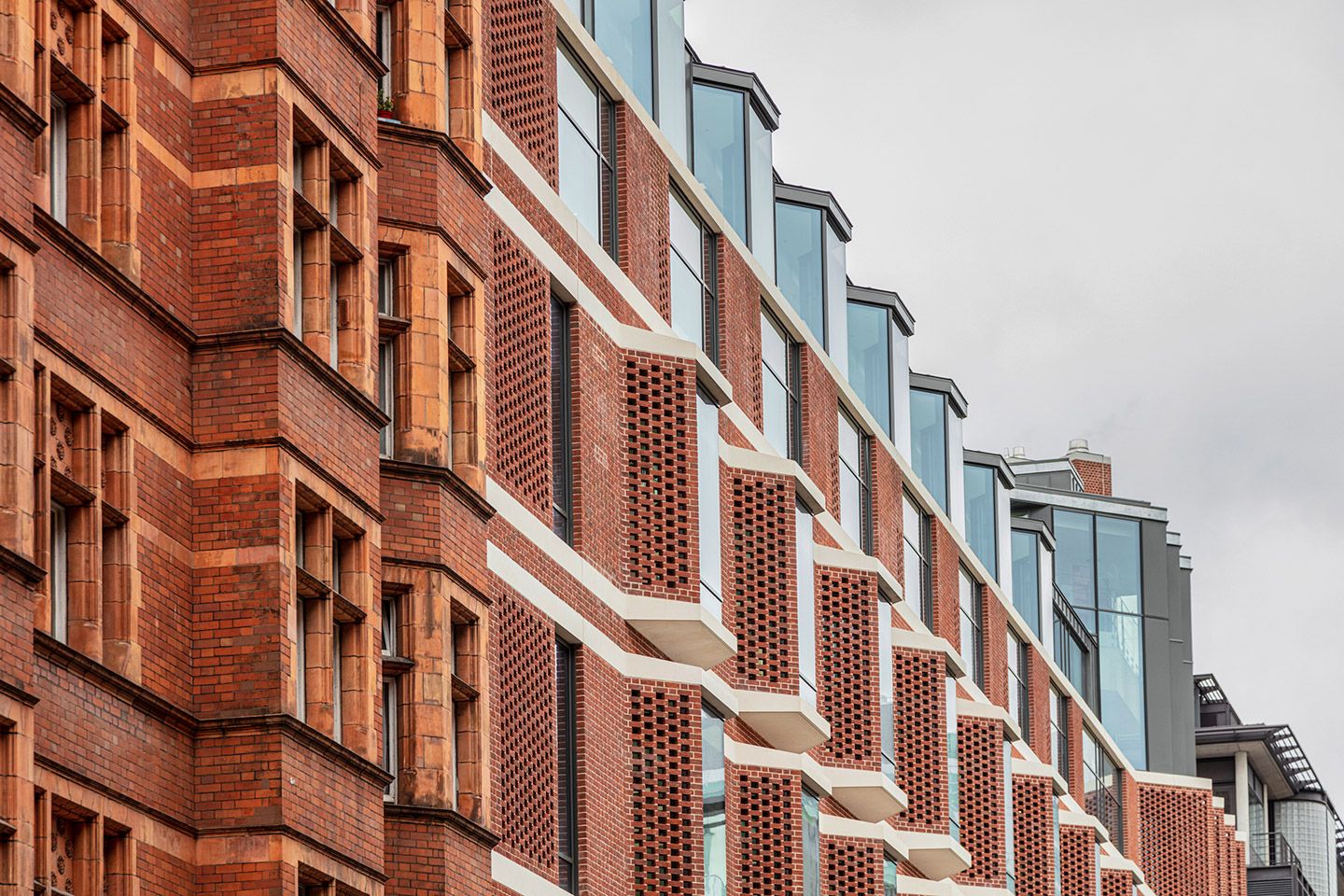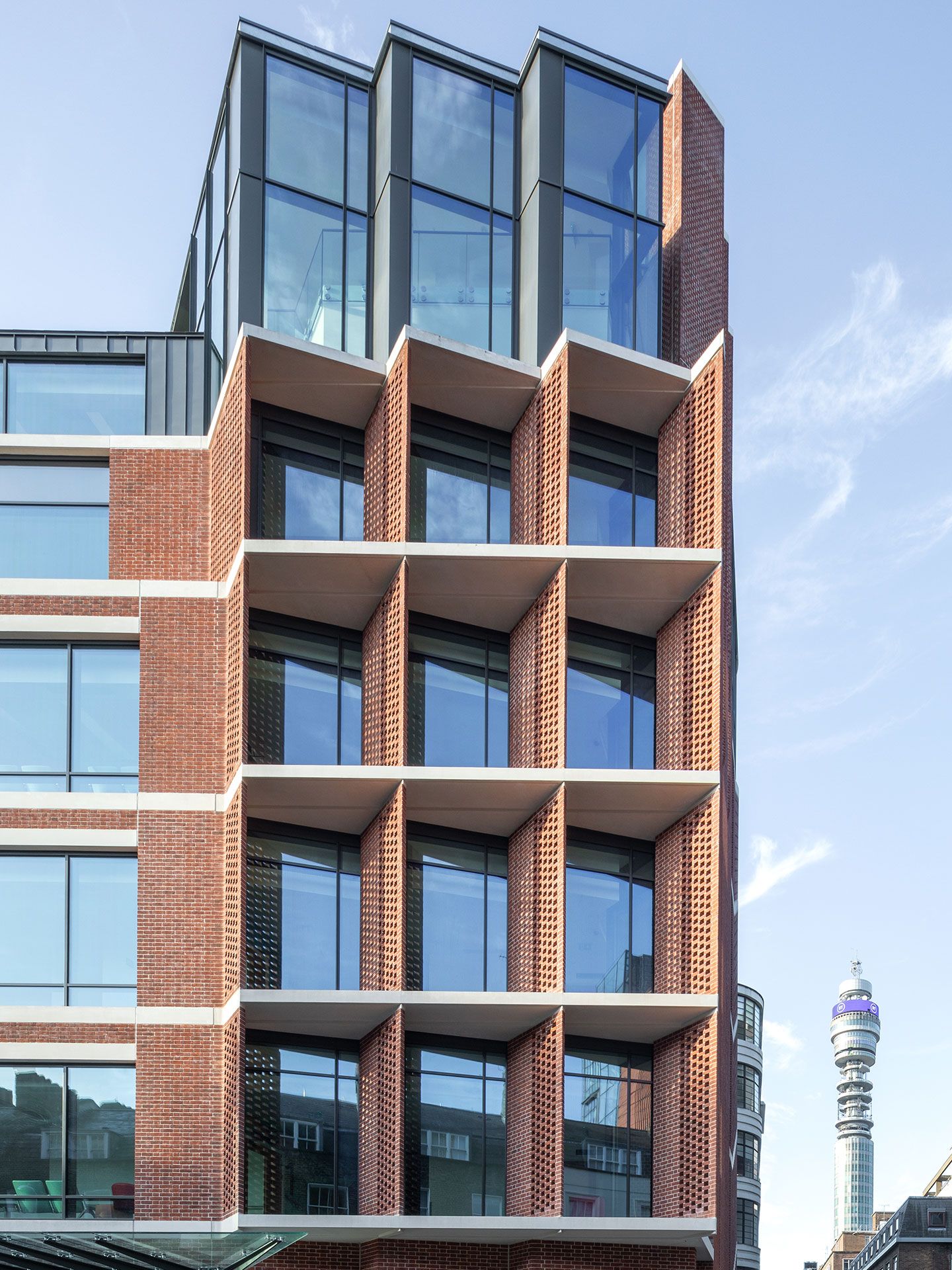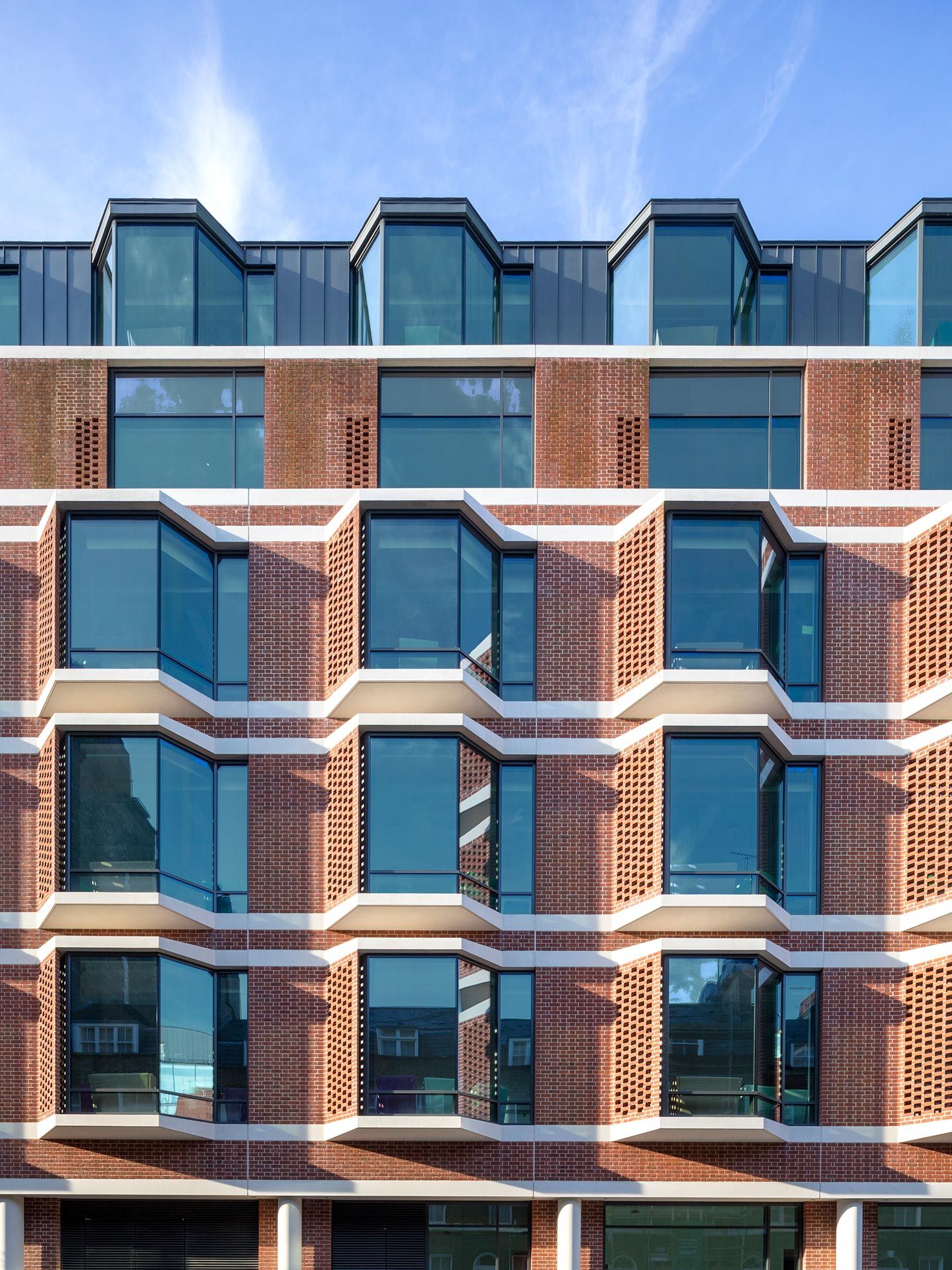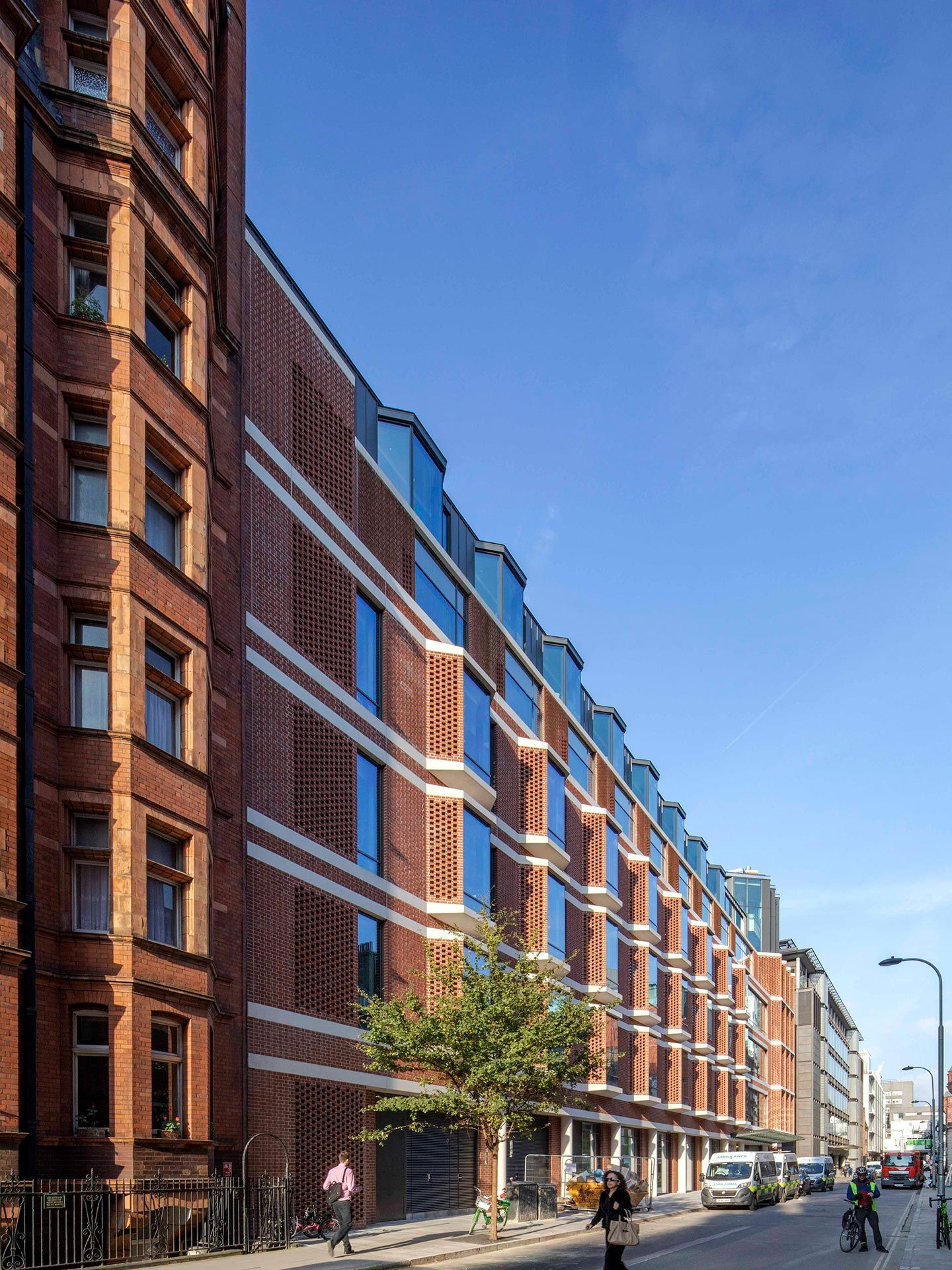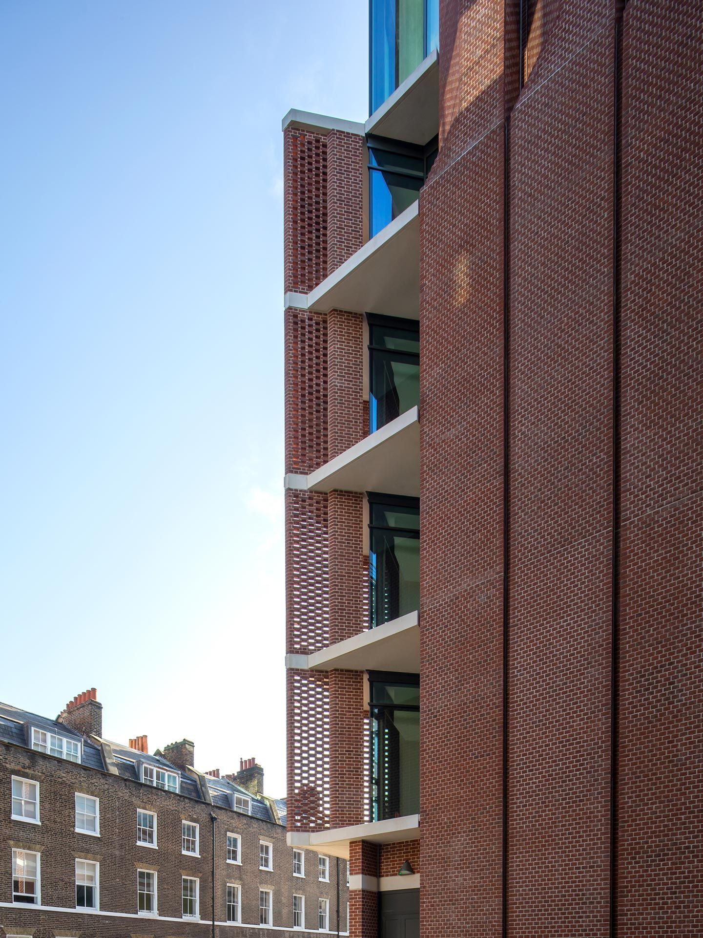 University College London Hospital’s (UCLH) new specialist facility for ear, nose and throat medicine is situated within the Bloomsbury Conservation Area. The hospital builds on the neighbourhood’s architectural heritage, while prioritising patient experience and operational efficiency. The scheme inverts the typical typology of windowless waiting rooms and clinical spaces along the elevation, placing circulation and shared waiting spaces along the façade. Wide bays, echoing the adjacent Victorian mansion block, feature floor-to-ceiling-windows, flooding the interiors with light while offering generous view out. The exterior combines pre-cast concrete bands, perforated masonry screens and traditional handmade brick, offering a contemporary interpretation of the surrounding listed residential buildings, while delivering passive shading to internal areas. The brickwork is complemented by exposed glass volumes, and elements of the core, including lifts, stairs and risers, are expressed in the external massing. This articulated silhouette denotes the hospital’s entrance for patients approaching from the north and west. A prefabrication process designed with the contractor reduced on-site health and safety risks and construction time while ensuring greater quality and finish. Efficient new service systems also help to reduce overheating and energy consumption, to create a high-performance clinical building. The scheme, which replaces the locally listed Royal Ear Hospital, represents close collaborative working with planning and heritage officers at the London Borough of Camden.