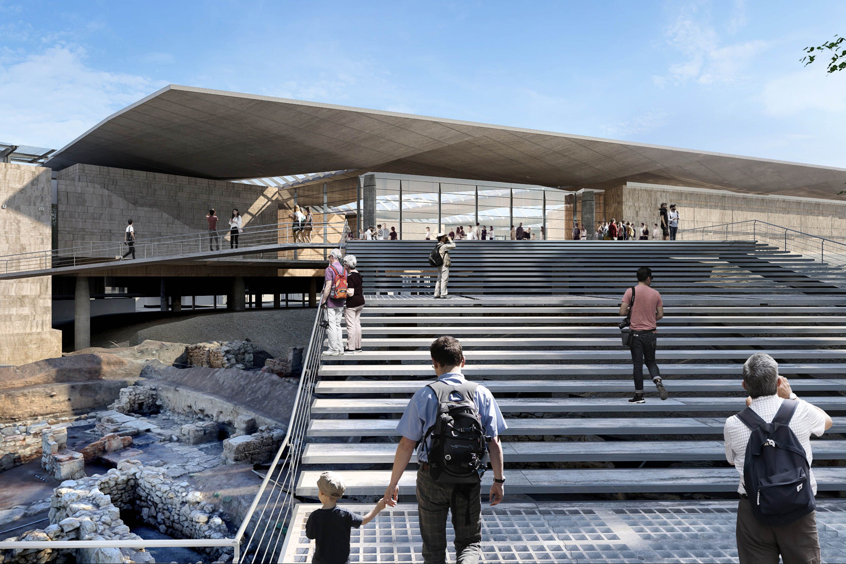 Our competition entry for a new Archaeological Museum for Cyprus ‘floats’ above a live archaeological dig in Nicosia, allowing visitors to directly observe and engage with the ongoing excavation, on the Hill of Agios Georgios. The scheme consists of an expansive platform raised above the excavation, along with an enfilade of exhibition spaces along the site’s perimeter to display the museum’s collection, with research, administrative and conservation spaces consolidated within an adjacent wing. The load-bearing structure of the main museum space features wide steel bays to minimise foundation works on the sensitive site, while the elevations will feature pale limestone to create a connection with the city’s traditional architecture. A sawtooth roof will bring in generous daylight, while helping to provide shade for visitors and protect the site from the elements. The site in Nicosia was originally earmarked for the country’s House of Representatives, until construction was paused following the discovery of significant and extensive remains traced back to the city’s first human settlement. Our proposal takes advantage of the excavations to contextualise the artefacts in the Museum’s collection, seeking to demonstrate the dynamic processes that characterise archaeological research, along with its power to continuously revise and enrich our understanding of the past.