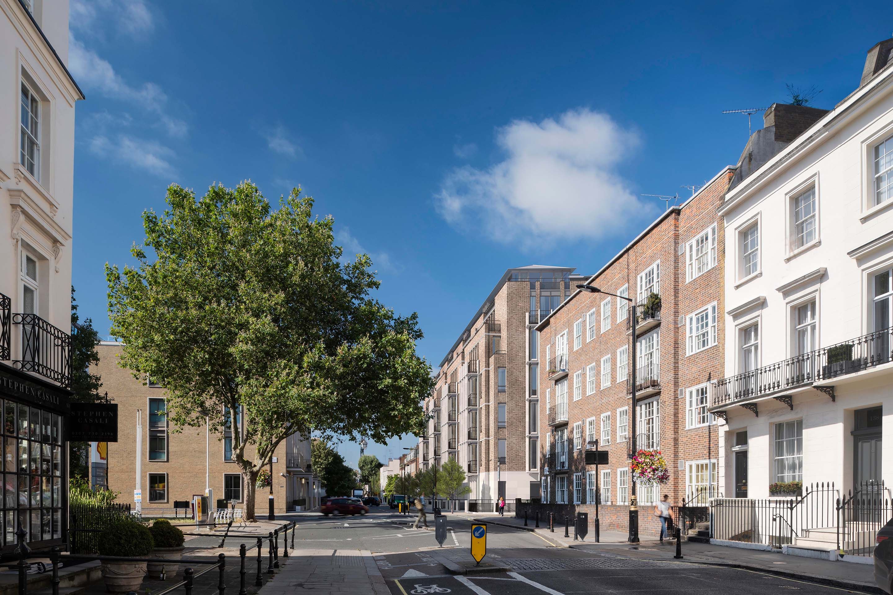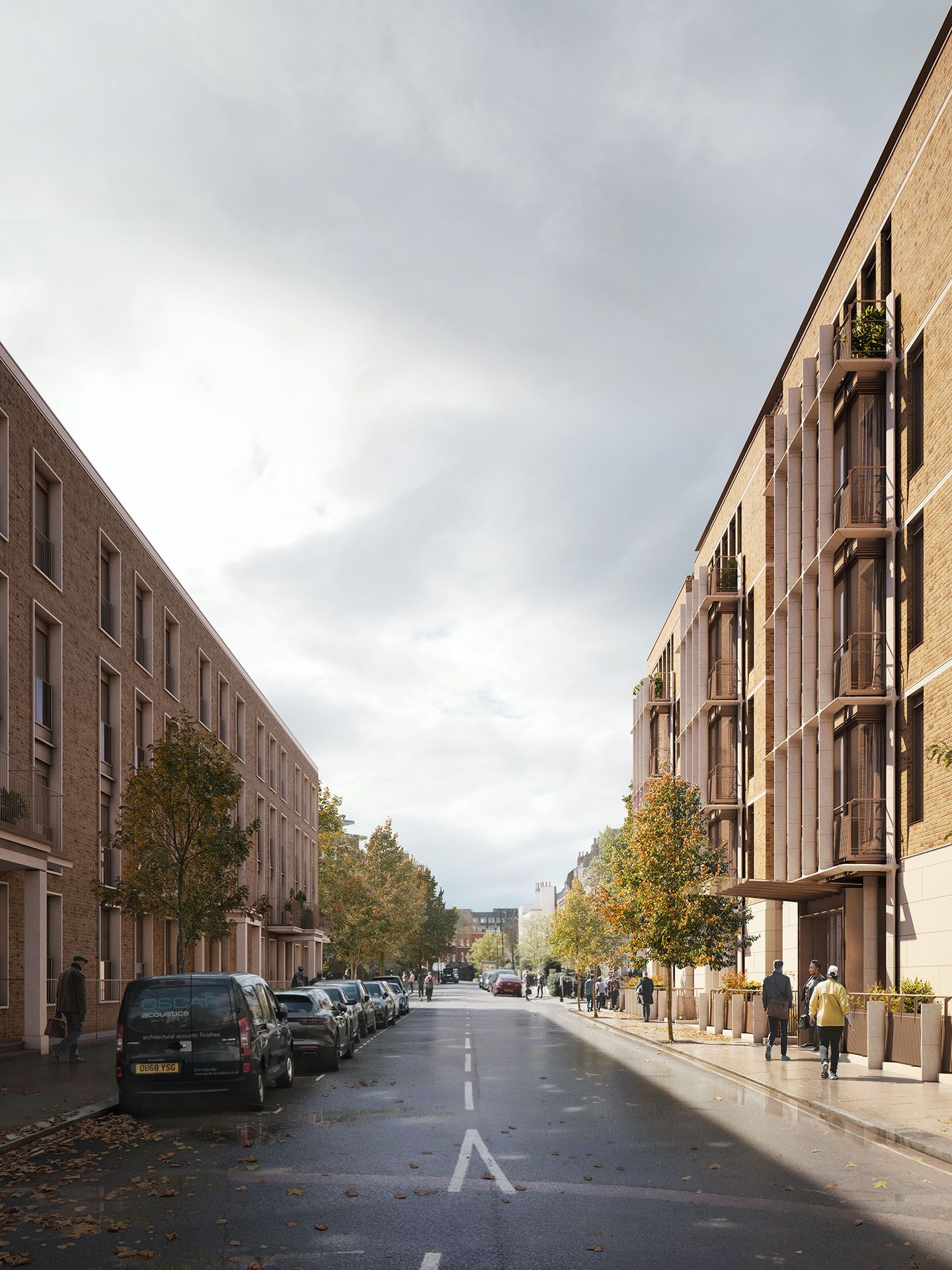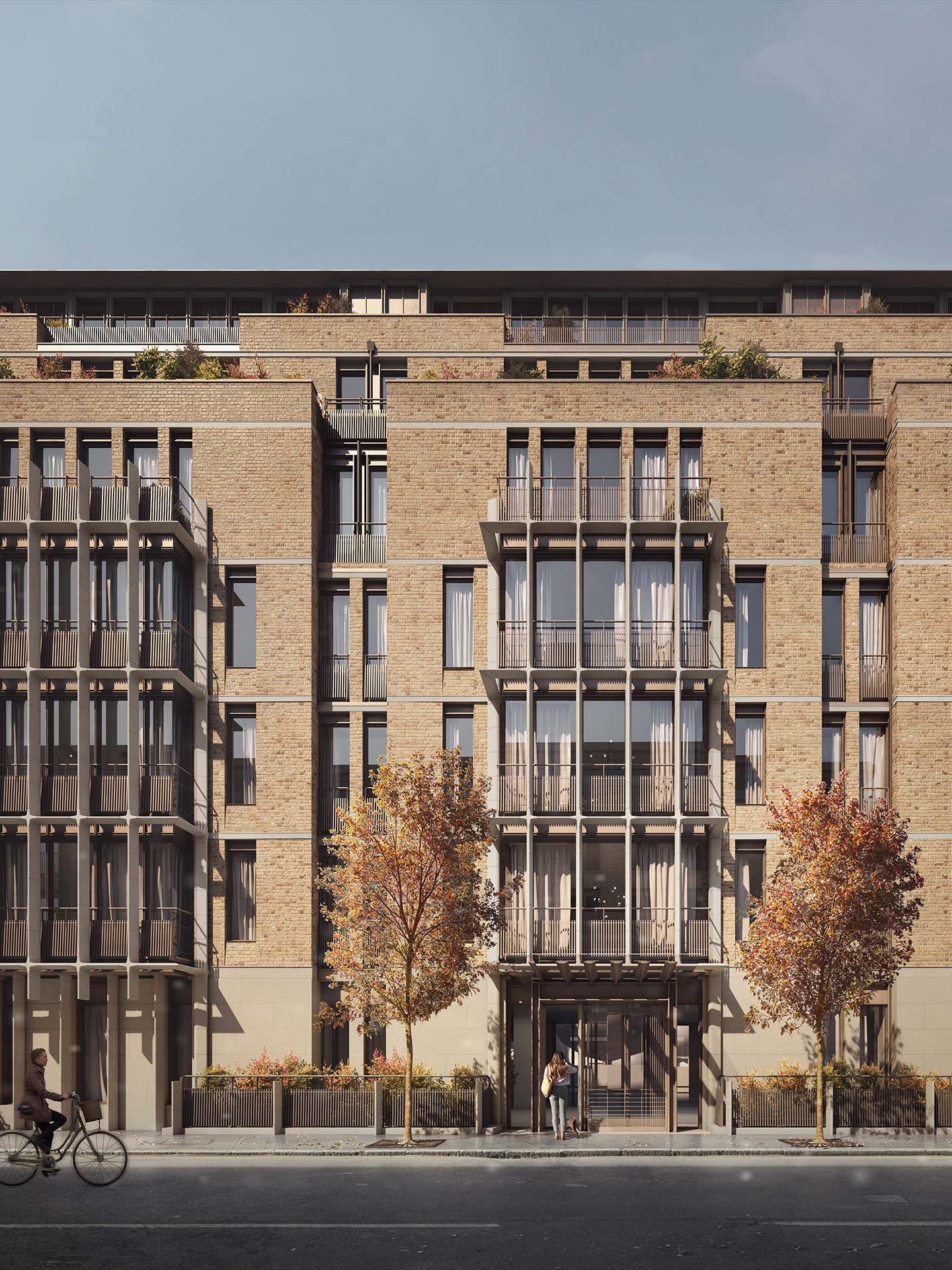 Our development proposal for this prominent site in south Belgravia will deliver 54 new homes within a new perimeter building, enhancing the heritage context through restoring the historic street line and the rhythm of town houses on surrounding terraces. Drawing on the logic and hierarchy of Thomas Cubitt’s original Regency plan, the proposal features a richly articulated seven-storey primary frontage with lower, pared back wings facing onto secondary streets, enclosing a green communal courtyard. In line with Westminster City Council’s planning policies, Kilmiur House is designed to provide a mix of residences including larger family-sized homes, upper floor apartments and duplex townhouse apartments. Two cores set within the inner corners of the plan are designed to optimise dual aspect living spaces, while lightwells at the lower and ground floors and a double-storey lobby will bring in additional natural light. The main elevation will feature a robust lime render plinth while the upper storeys will be clad in London stock brick. Generous bays and set-back upper storeys with balconies and terraces provide further architectural articulation. Finer elements, including delicate screens on the bays, formed of white precast concrete, recall the white window cornicing of Belgravia. The scheme is designed to implement passive design measures, including a high-quality envelope and efficient air source and water heat pumps to achieve a 54.8% reduction in its overall CO2 emissions.