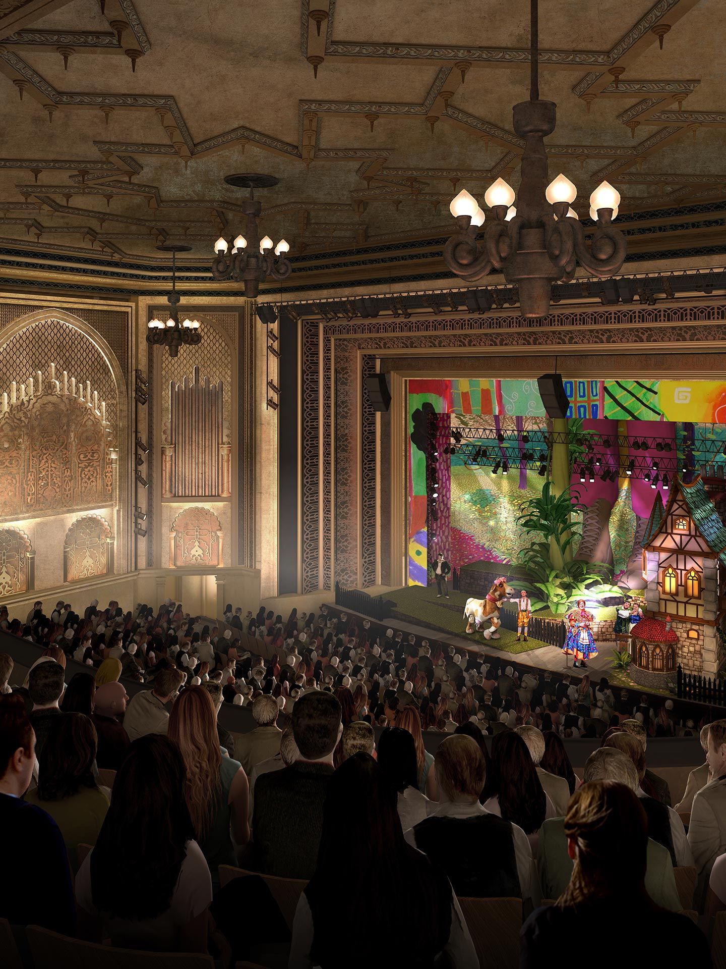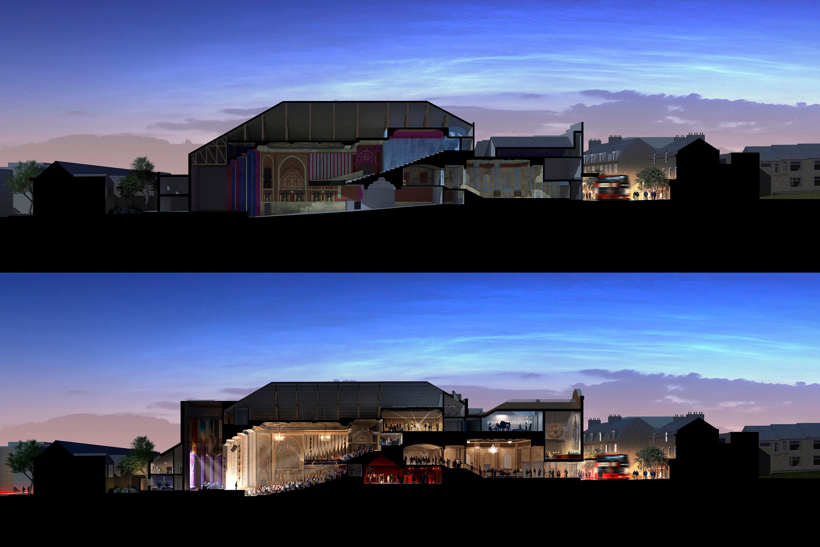 Soho Theatre Walthamstow represents the renewal of the former Granada, a Grade II* listed interwar cinema into a vibrant cultural hub for the community. By adapting the cinema’s large auditorium into a more intimate 1,000 capacity venue, with curved stall seating, our design enhances sightlines, and the audience connection with actors onstage, while preserving and restoring the venue’s much-loved heritage interiors. Externally, the original high street frontage, including the building’s Spanish baroque gable and ornate first-storey windows has been reinstated. Inside, a new fly tower supports a larger stage and new dedicated backstage area, while a new street entrance creates greater flexibility, enabling the venue to stage a wider range of productions. The design also allows for a new and enlarged foyer and the addition of community spaces to support a range of cultural and educational activity. The auditorium is insulated and wrapped in durable zinc cladding, and two additional circulation cores on either side of the foyers are designed to improve accessibility and accommodate new, energy efficient heating and cooling systems. Combined with a photovoltaic array on the south facing portions of the roof, the building is set to outperform the original building’s energy performance by 80%. Having stood empty for the last 15 years, the cinema was the subject of a community campaign for its restoration. The project forms the centrepiece of a wider, culturally led regeneration initiative by Waltham Forest.