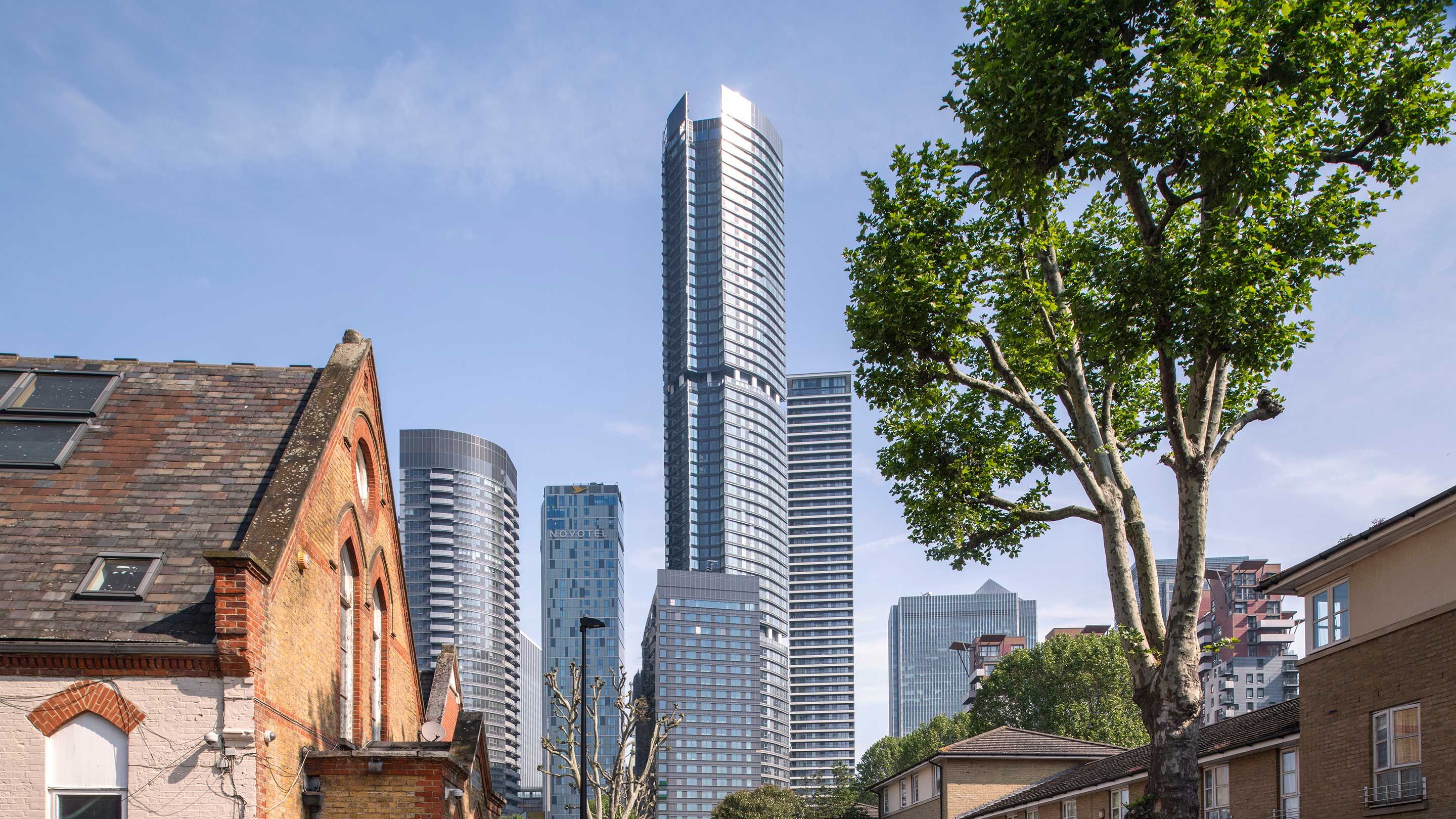 Our design for Aspen, a new mixed-use development in Canary Wharf, reinvents vertical urbanism to deliver an ambitious mix of functions, while emphasising street-level experience and addressing London’s housing need. The compact site will deliver residential, hotel, health centre and primary school around a new public space close to the Elizabeth Line’s Canary Wharf Station, also creating a new hub between Marsh Wall and the Isle of Dogs. The centrepiece of the new community will be a renovated 1860s public house. This will be surrounded by a landscaped square, and two mixed-use towers. One 65-story tower will contain 495 homes, a modern health care centre and a five-star hotel. Alongside 200 rooms, the BREEAM Excellent hotel will provide public facilities including a cafe, restaurant, conference space, as well as a roof garden, spa and pool. At ground floor, the public space will be further animated by a range of shops. A lower, 35-storey tower will comprise 139 affordable homes alongside a new community space, and on-site primary school. The design utilises our in-house AI design optimisation tool to ensure favourable aspect and layout for each home within the triangular plan of the towers . To reduce energy consumption, the scheme is part of a district wide heating and cooling network, using highly efficient water source heat pump technology to supply 20,000 people across the area, including residents, hotel guests and other users.