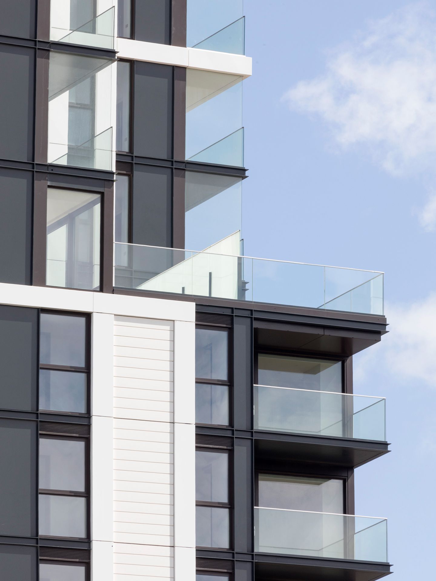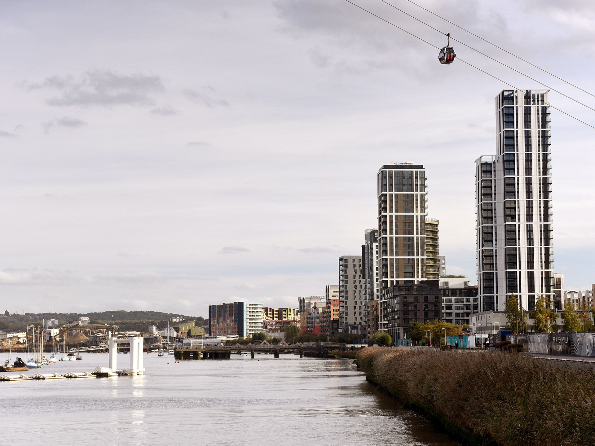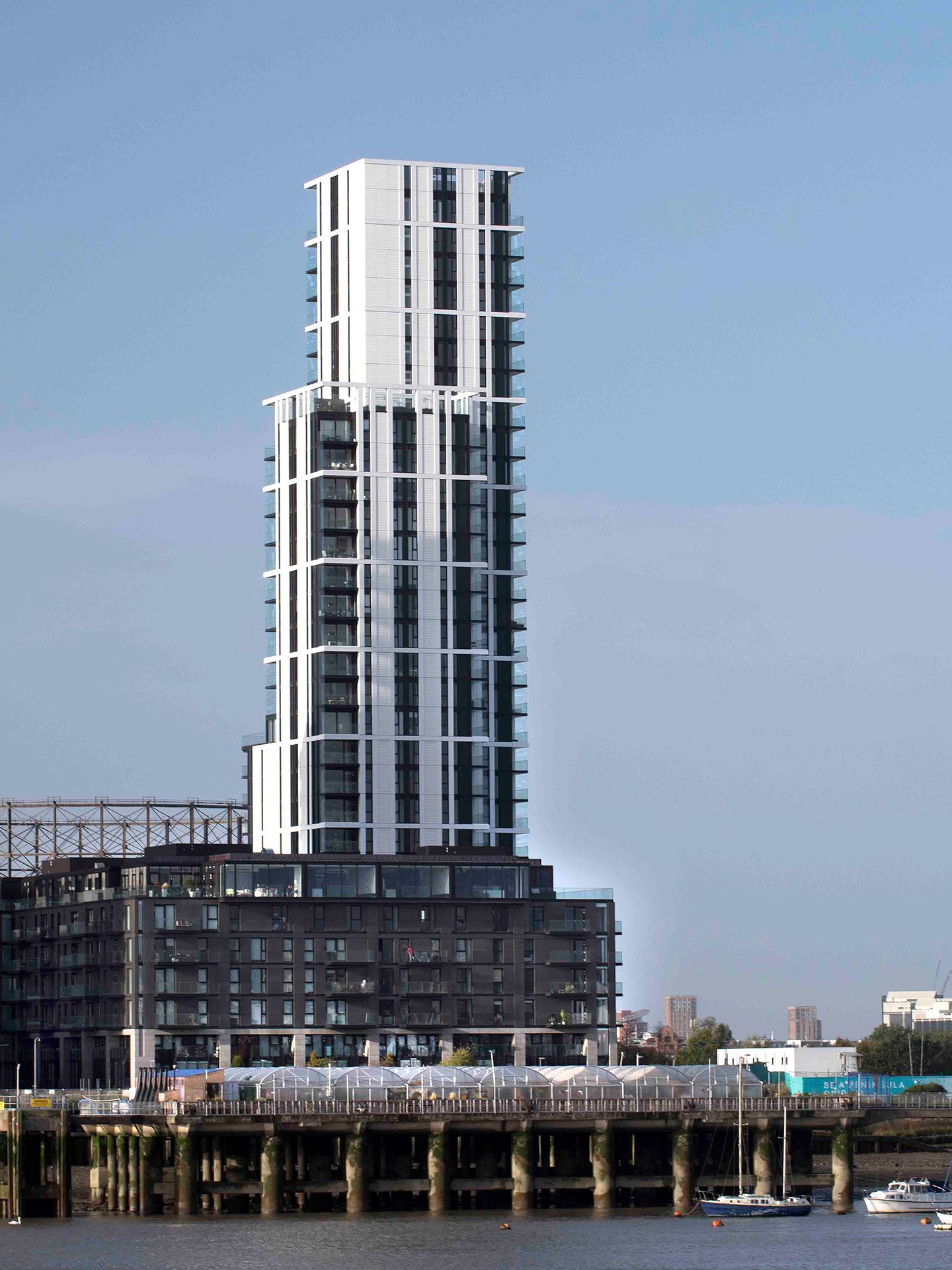 The Waterman is a key residential aspect of the Greenwich Riverside masterplan. Comprising a slender tall building, a perimeter block with a courtyard and a new public square, it delivers 269 new homes, and public amenities, at the heart of a new urban district in the east of Greenwich Peninsula. The first of the two residential buildings is a six-storey block, with carefully scaled street facades at the perimeter, and a private internal garden for residents. Townhouses activate the base of the building; their two-storey scale expressed as a robust stone plinth. The top floor cantilevers out towards the Thames, to create four penthouses with an uninterrupted panorama of the London Docklands, plus views over the waterfront and the Thames’ historic coal loader jetty. On a grander scale is the 31-storey tower. This waterside residential building incorporates two wings flanking a central core. Each wing contains three homes, ensuring each apartment is dual aspect, while L-shaped living rooms set around generous corner balconies maximise panoramic views. At the uppermost floors, the tower steps back to a single wing, giving way for a communal residential garden, and creating a refined silhouette. At basement level, the tower features additional communal facilities for all residents, including a cinema and club room. Ground floor residential is elevated above semi-recessed parking, lifting these apartments, with private terraces overlooking the footway, above the public realm. This gentle rise in the road also creates step-free access to the public square, Tidemill Square, which connects to a shared landscaped courtyard beyond.